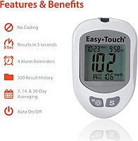 EasyTouch is designed for fingertip testing and delivers results in approximately 5 seconds. The meter is specified to use a small blood sample volume of 0.5 microliter and provides onboard memory storage for up to 300 results.