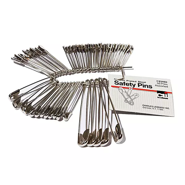 These assorted size safety pins are supplied in a 50-count pack and designed for general-purpose fastening needs. Common uses include clothing and fabric fastening, quick repairs, securing bandages or wraps (non-sterile general use), and organizing small items.